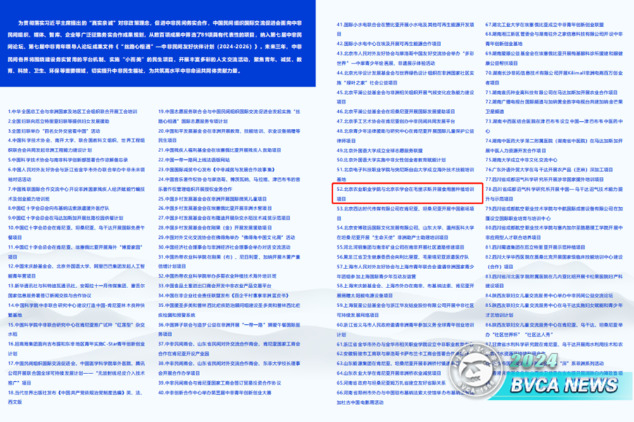 近期,中國民間組織國際交流促進會(簡稱“中促會”)發布了第七屆中非民間論壇、第七屆中非青年領導人論壇成果文件《“絲路?相通”―中非民間友好伙伴計劃(2024-2026)》,學校與北京農學會、毛里求斯福爾肯聯盟合作申報的《“一帶一路”及非洲農業國家合作的北農方案》被納入中非民間友好伙伴計劃。