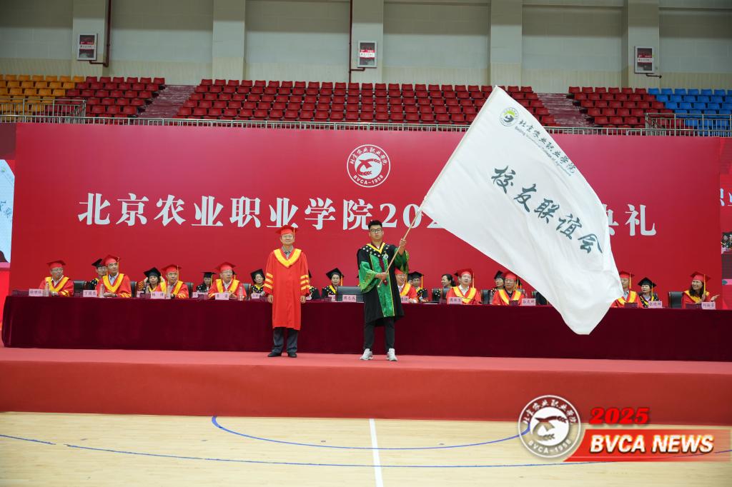 周志成代表學校接受畢業生贈禮,并向畢業生贈送校友旗,將傳承母校精神的接力棒鄭重交到2025屆農職校友手中。主席臺前排領導向畢業生贈送“農職護航傘”,表達母校永遠為學生遮風擋雨、護航學生前行的永恒承諾。