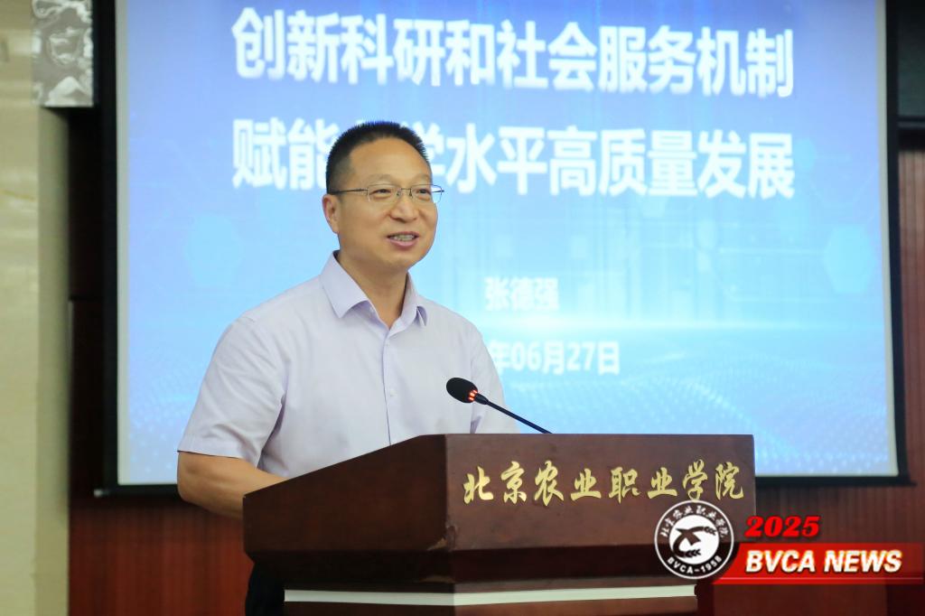 黨委副書記、院長張德強作題為《創新科研社會服務機制賦能辦學水平高質量發展》的主旨報告,全面回顧了“十四五”期間,學校以鄉村振興戰略為指引在科研與技術服務、社會培訓和國際合作交流三方面取得的顯著工作成效;同時指出當前在科研機制、培訓制度等方面的不足;重點部署了“十五五”期間推動科研與社會服務高質量發展的七大任務,明確以科研與社會服務為雙輪驅動,賦能辦學水平高質量發展的實踐路徑。報告以“數據支撐”彰顯成就,以“問題導向”剖析短板,以“戰略思維”描繪藍圖,明確了學校科研與社會服務工作發展的目標。