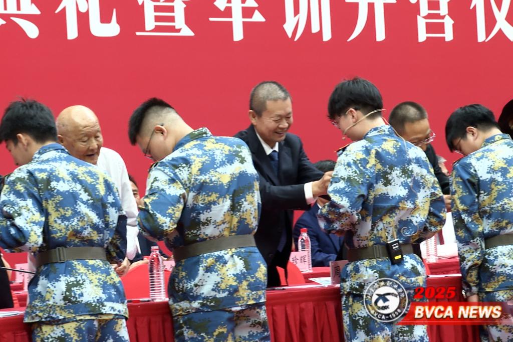 周志成莊嚴地將軍訓團團旗授予軍訓團教官代表,標志著學校2025年新生軍訓團正式成立。