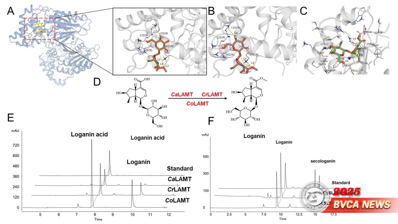 在此基礎上,團隊鑒定了山茱萸特有的馬錢苷合成通路關鍵基因簇,包含了馬錢子酸O-甲基轉移酶(LAMT)和7-脫氧葡萄糖酸7-羥化酶(7-DLH)等關鍵合酶基因。分子動力學模擬與酶動力學分析表明,與近緣物種相比,山茱萸LAMT酶能夠優先催化馬錢苷酸的C-9位羥基化反應,顯著增強了馬錢苷酸向馬錢苷的催化活性(圖3)。特別是,團隊將山茱萸LAMT基因及其上游調控因子導入本氏煙草,成功實現了馬錢苷衍生物的從頭生物合成(圖3)。本研究揭示了山茱萸中完整的馬錢苷生物合成通路,為馬錢苷及其衍生物的藥物開發與產業化應用提供了科學理論指導。