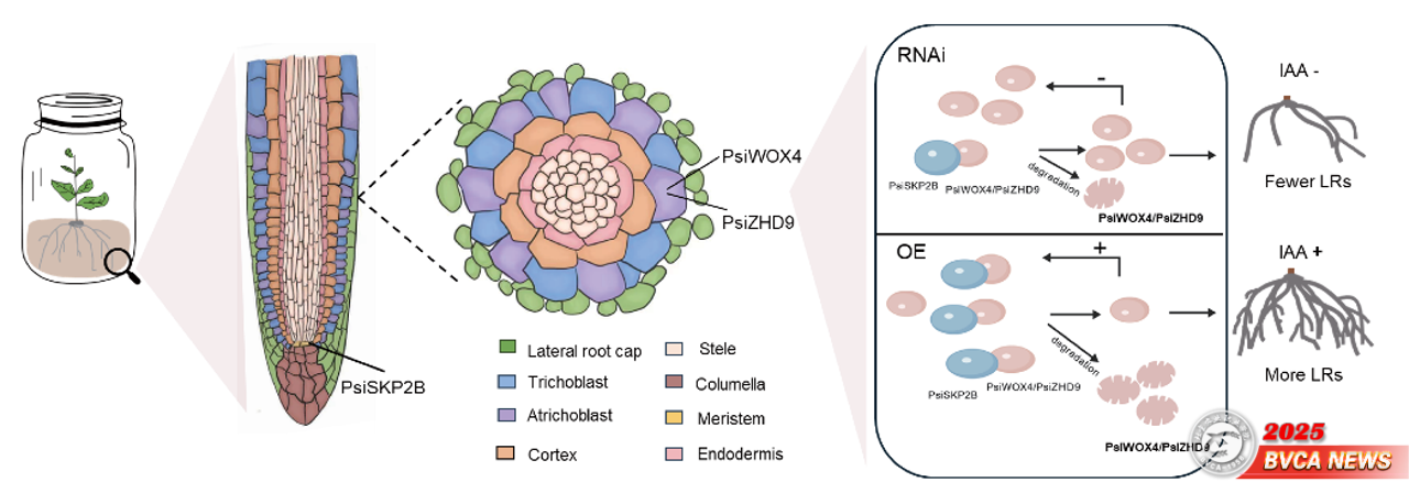 為揭示PsiSKP2B調控根系發育等分子作用機制,構建了PsiSKP2B的楊樹遺傳轉化株系,發現PsiSKP2B是楊樹側根發育等正向調控因子。聯合利用共表達網絡分析以及酵母雙雜交、蛋白免疫共沉淀、泛素化等分子生物學實驗,發現PsiSKP2B能夠提高根系生長素含量,泛素化降解PsiZHD9與PsiWOX4蛋白,正向調控楊樹側根發育。綜上所述,本研究首次在木本植物中構建了從表型到基因、從組織到細胞的多層次調控框架,為今后林木根系遺傳改良、植株形態建成、抗旱耐鹽品種選育提供了新靶點與技術支撐。
