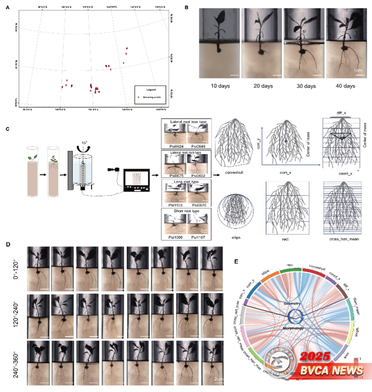 根系作為吸收樹木水分與營養元素、維持形態結構穩定性的重要器官,其構型特征直接影響植物生長發育、抗逆能力與形態建成。然而,林木具有多年生、植株高大、根系結構復雜等生物學特點,特別是由于根系埋藏于地下,表型獲取困難,其遺傳調控機制在林木中長期以來研究不足。其根系表型的高通量無損數字化獲取仍存在技術瓶頸,導致木本植物根系構型的遺傳基礎研究進展緩慢。為此,團隊依托小葉楊種質資源群體(303份),整合3D成像技術與圖像分割算法,開發了林木根系表型組學分析體系,系統分析了小葉楊種質資源群體根系表型特征,構建了包含96個微觀性狀的根系表型數據集。利用全基因組關聯分析(GWAS)方法,揭示了小葉楊根系構型的遺傳基礎,鑒定了72個影響根系構型的關鍵基因,主要涉及細胞分裂、側根形成、分生組織發育以及激素信號傳導等生物學過程。特別是,發現編碼F-box泛素連接酶基因PsiSKP2B與6個根系性狀存在顯著關聯,表明其在楊樹根系發育過程中的潛在重要功能價值。