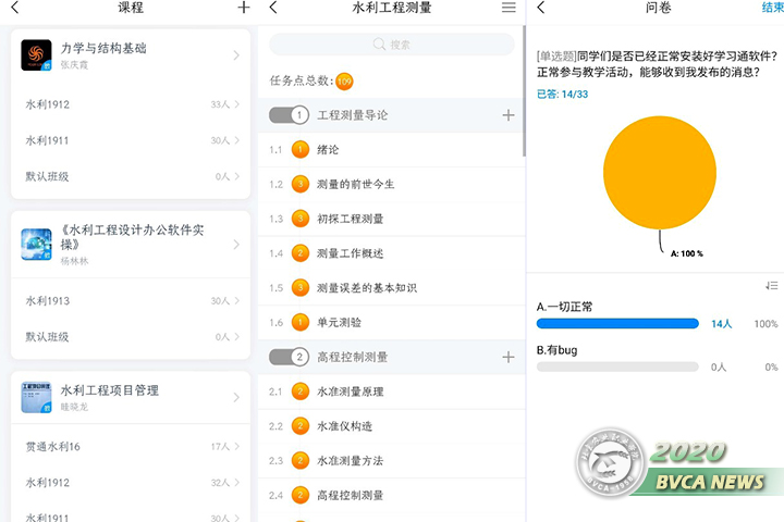 專業積極響應市教委“停課不停學”的號召,在學院和系部的領導下,積極籌備延期開學期間各項教學準備。所有水利專業任課教師,都認真學習了教務處組織的“學習通”和“泛雅網絡教學平臺”的網絡教學實操培訓,本學期所有課程都已在平臺搭建完成。教師們認真研討、精心設計,設置了速課、視頻、討論、考核等教學互動環節,高標準、嚴要求,確保教學有序開展。專業主任以團隊教師身份加入所有網絡課程,實時了解課程內容、課程建設進度等情況。