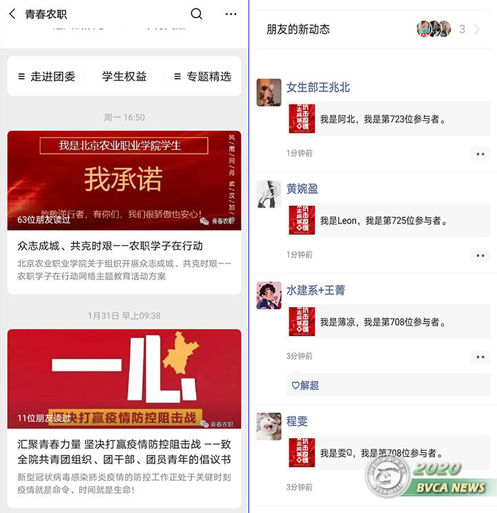 院團委聯合學院宣傳部、學工部作制定《北京農業職業學院關于組織開展“眾志成城、共克時艱——農職學子在行動”網絡主題教育活動方案》,引導學通過網絡課堂、在線班會、網絡征文、創作網絡作品等線上活動,普及科學防疫知識,宣傳中國特色社會主義的巨大制度優勢,傳播疫情防控感人故事,做到統一思想認識,穩定心態情緒,做好個人防護。