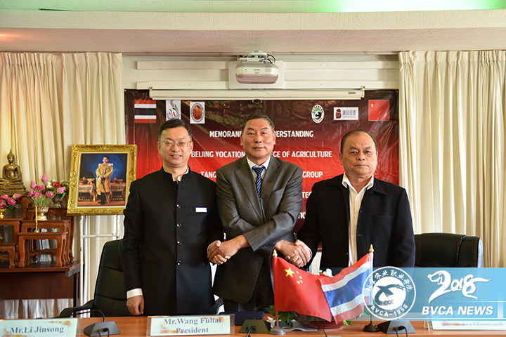 王福海院長、唐風漢語國際教育集團總裁李勁松、泰國北部農業職業教育中心主任巴乍、披集農業技術學院院長塔您分別在簽約儀式上致辭并代表合作各方先后簽署了“北京農業職業學院、披集農業技術學院合作設立北京農業職業學院泰國分院框架協議”、“互聯網+中泰國際聯合辦學合作協議”和“泰國教育部職業教育委員會北部農業職業教育中心、北京農業職業學院、北京唐風漢語教育科技有限公司合作備忘錄”等三個合作協議。根據簽署的協議,學院將在泰國披集農業技術學院設立“北京農業職業學院泰國分院”,向泰國輸出中國農業職業教育專業和課程等教學資源,與以披集農業技術學院牽頭的泰國北部農業職業教育中心所轄農業技術學院合作開展中泰農業高職學歷教育合作辦學。根據當天討論確定的“共同行動計劃”,2019年5月首批園藝技術專業高職學歷教育的泰國學生將進入項目學習。