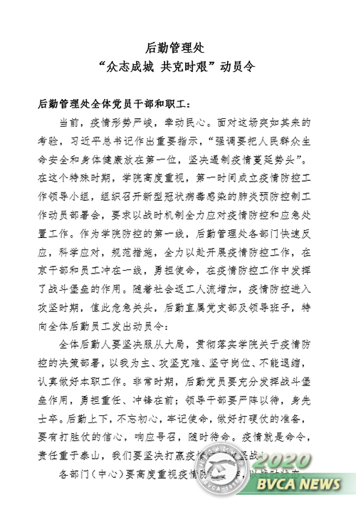 為進一步發揮后勤直屬黨支部戰斗堡壘作用,發揮黨員旗幟作用,沖在一線把群眾帶動起來、凝聚起來、組織起來,全面構筑聯防聯控、群防群治的嚴密防線,守護師生幸福安康,后勤直屬黨支部于防控時期成立了疫情防控黨員突擊隊,并向后勤全體黨員發出了“眾志成城 共克時艱”動員令。