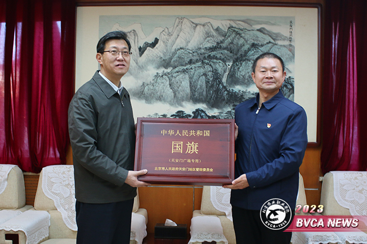 12月20日下午,北京市人民政府天安門地區管理委員會向學校贈送國旗儀式在天安門地區管委會辦公樓舉行。天安門地區管委會黨組成員、副主任姚輝(正局長級)向學校贈送國旗,學校黨委書記周志成代表學校接收國旗。天安門地區管委會廣場管理處處長王彥榮、副處長張鴻飛,學校黨委常委、副院長楊博以及組織部、學工部、團委負責同志參加贈旗儀式。