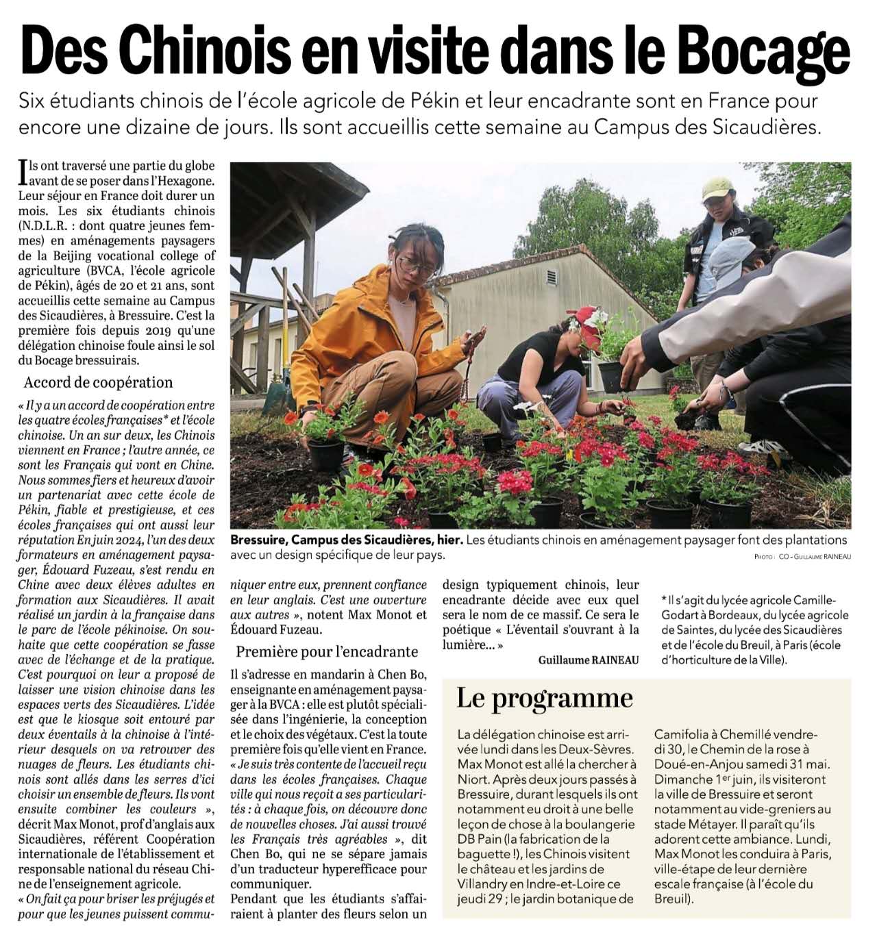 中國代表團于本周一抵達德塞夫勒省,由馬克斯·莫諾前往尼奧爾市迎接。代表團成員在布雷敘爾市停留了兩天,在此期間深入體驗了當?shù)厣?,例如,在當?shù)厣狭艘惶蒙鷦拥姆▏称分谱鲗嵺`課等。隨后還開展了豐富的文化參訪活動:參訪安德爾-盧瓦爾省的維蘭德里城堡及花園并開展實踐教學;探訪舍米耶市的卡米富麗雅植物園開展實踐學習;漫步杜埃-昂安茹市的玫瑰之路并開展實踐學習;前往植物世界進行實踐學習;代表團將在馬克斯·莫諾陪同下前往最后一站——巴黎布勒伊爾學院,為此次法國之行圓滿收官。