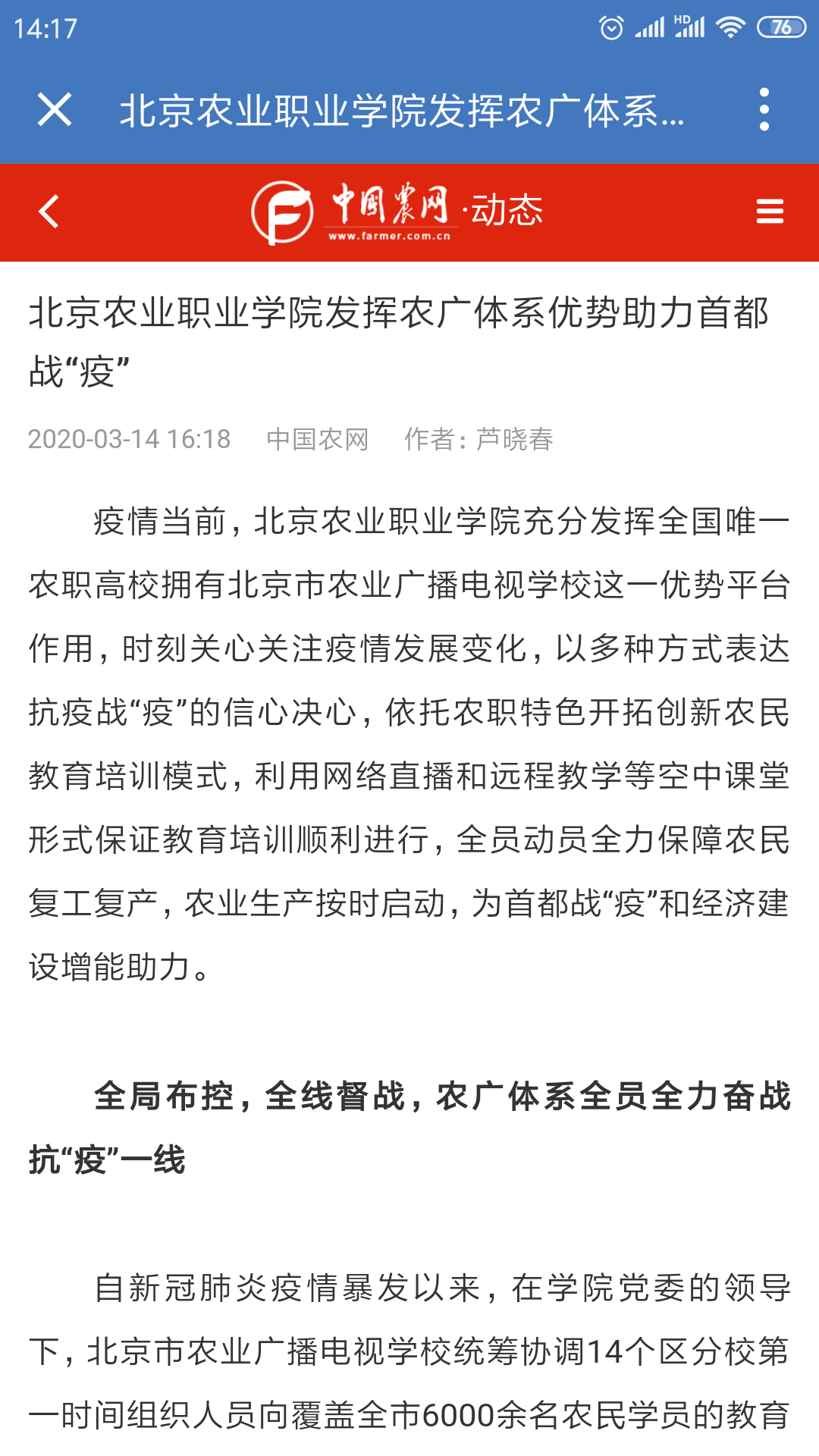 3月14日北京農網:北京農業職業學院發揮農廣體系優勢助力首都戰“疫”