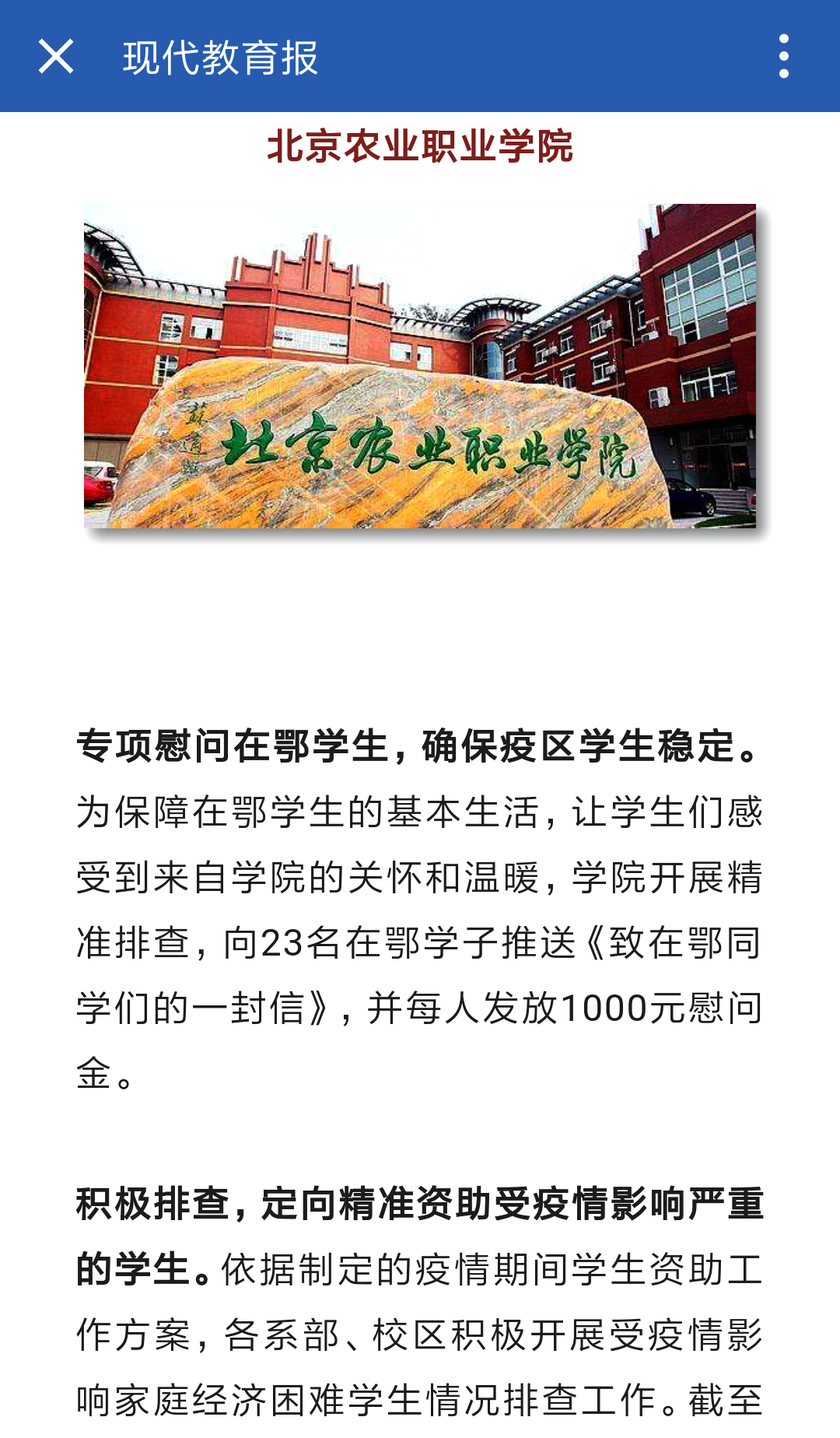 3月23日《現(xiàn)代教育報》:上網(wǎng)流量補貼、云勤工助學……北京精準資助,解決學生 “疫”路之困