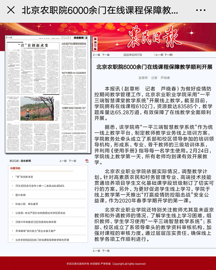 3月17日《農民日報》第3版:北京農職院6000余門在線課程保障教學順利開展