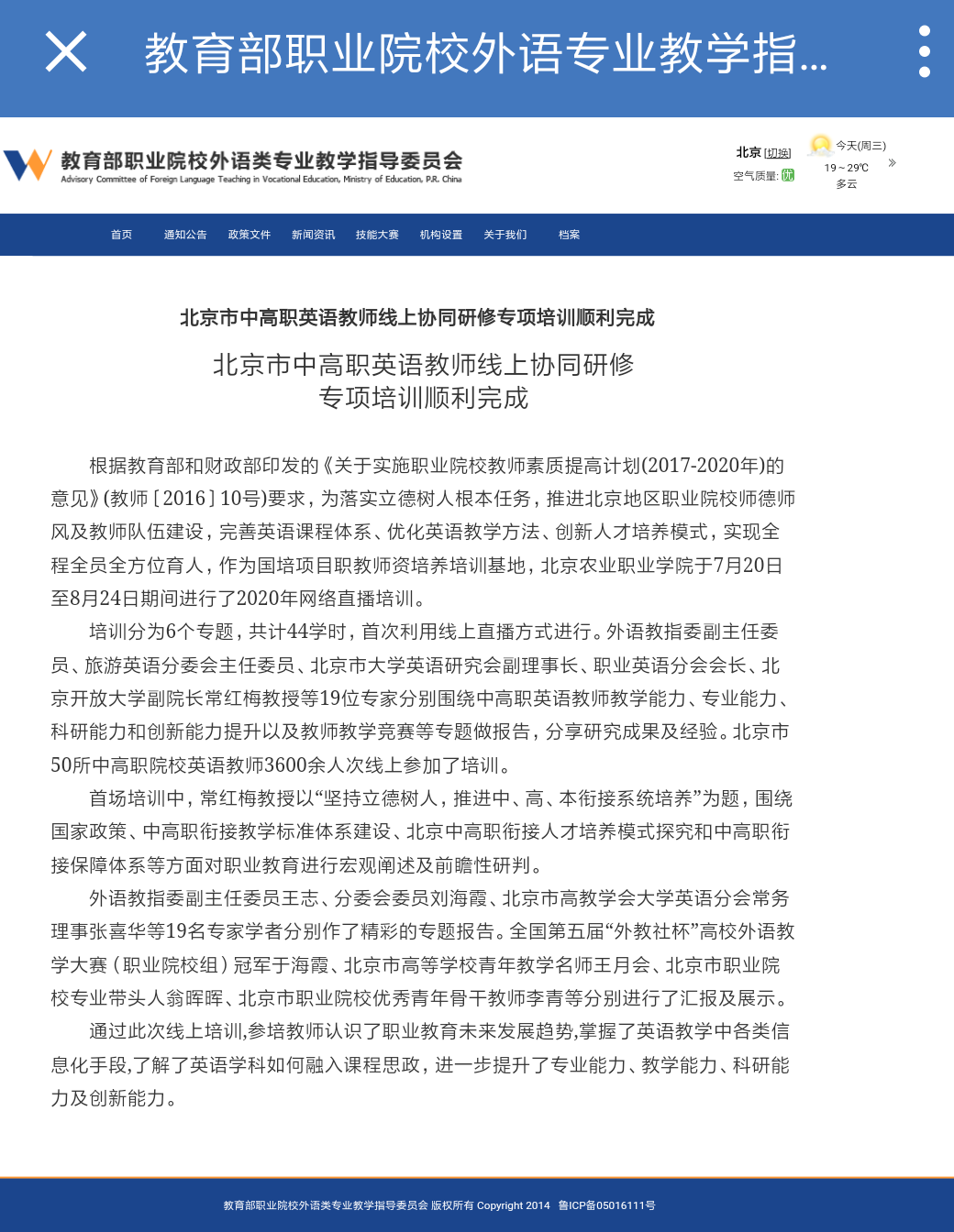 根據(jù)教育部和財政部印發(fā)的《關(guān)于實施職業(yè)院校教師素質(zhì)提高計劃(2017-2020年)的意見》(教師〔2016〕10號)要求,為落實立德樹人根本任務,推進北京地區(qū)職業(yè)院校師德師風及教師隊伍建設(shè),完善英語課程體系、優(yōu)化英語教學方法、創(chuàng)新人才培養(yǎng)模式,實現(xiàn)全程全員全方位育人,作為國培項目職教師資培養(yǎng)培訓基地,北京農(nóng)業(yè)職業(yè)學院于7月20日至8月24日期間進行了2020年網(wǎng)絡直播培訓。
