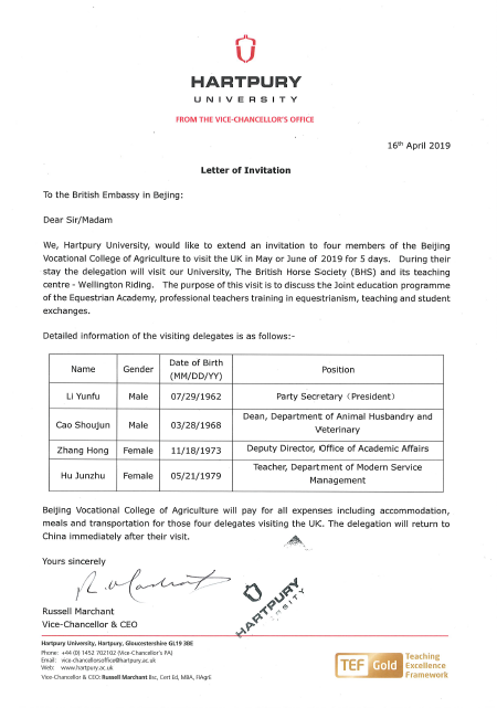 團(tuán)員,負(fù)責(zé)馬術(shù)學(xué)院教學(xué)及管理工作。本次訪問負(fù)責(zé)與哈特伯瑞大學(xué)商談國際馬術(shù)學(xué)院建設(shè)的相關(guān)合作項目,溝通商談運(yùn)動馬馴養(yǎng)與疾病防治及休閑馬術(shù)管理專業(yè)課程引進(jìn)、專業(yè)及教學(xué)交流、馬術(shù)專業(yè)師資培訓(xùn)、學(xué)生交流等合作的具體事宜,溝通落實今年教師赴該校專業(yè)培訓(xùn)的具體安排和要求等。