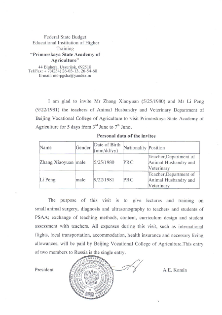 我院應俄羅斯濱海國立農學院的邀請,擬于2019年6月3日-6月7日派出2名教師赴該院進行講學及教學交流,在外停留時間5天。