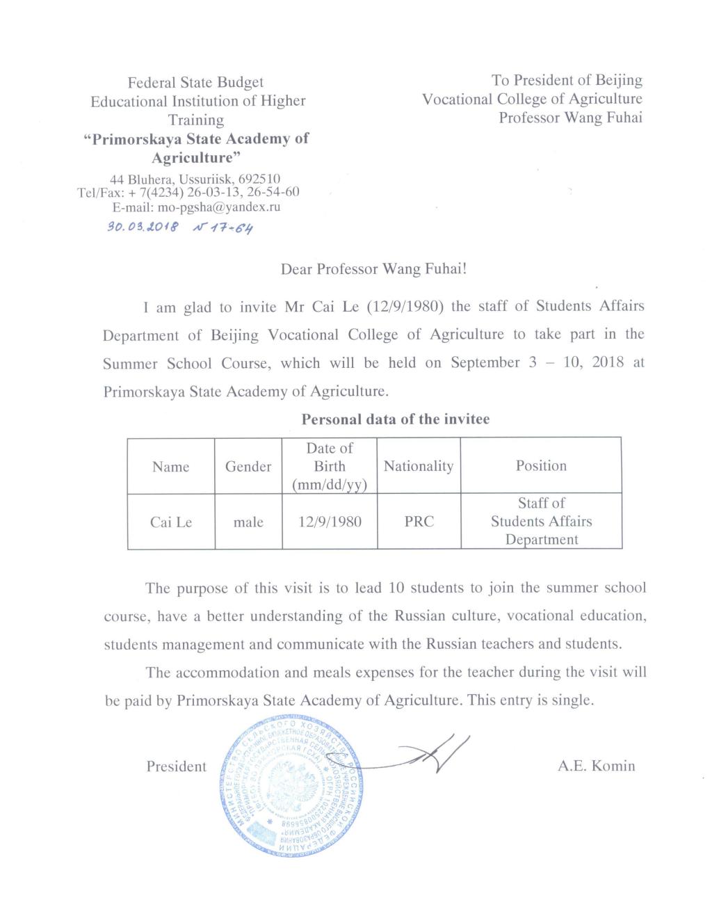 我院應(yīng)俄羅斯濱海國立農(nóng)學(xué)院邀請,擬于2018年9月3日-10日派出1名教師帶10名學(xué)生團組赴該校進行學(xué)習(xí)交流活動,在外停留時間8天。相關(guān)信息公示如下: