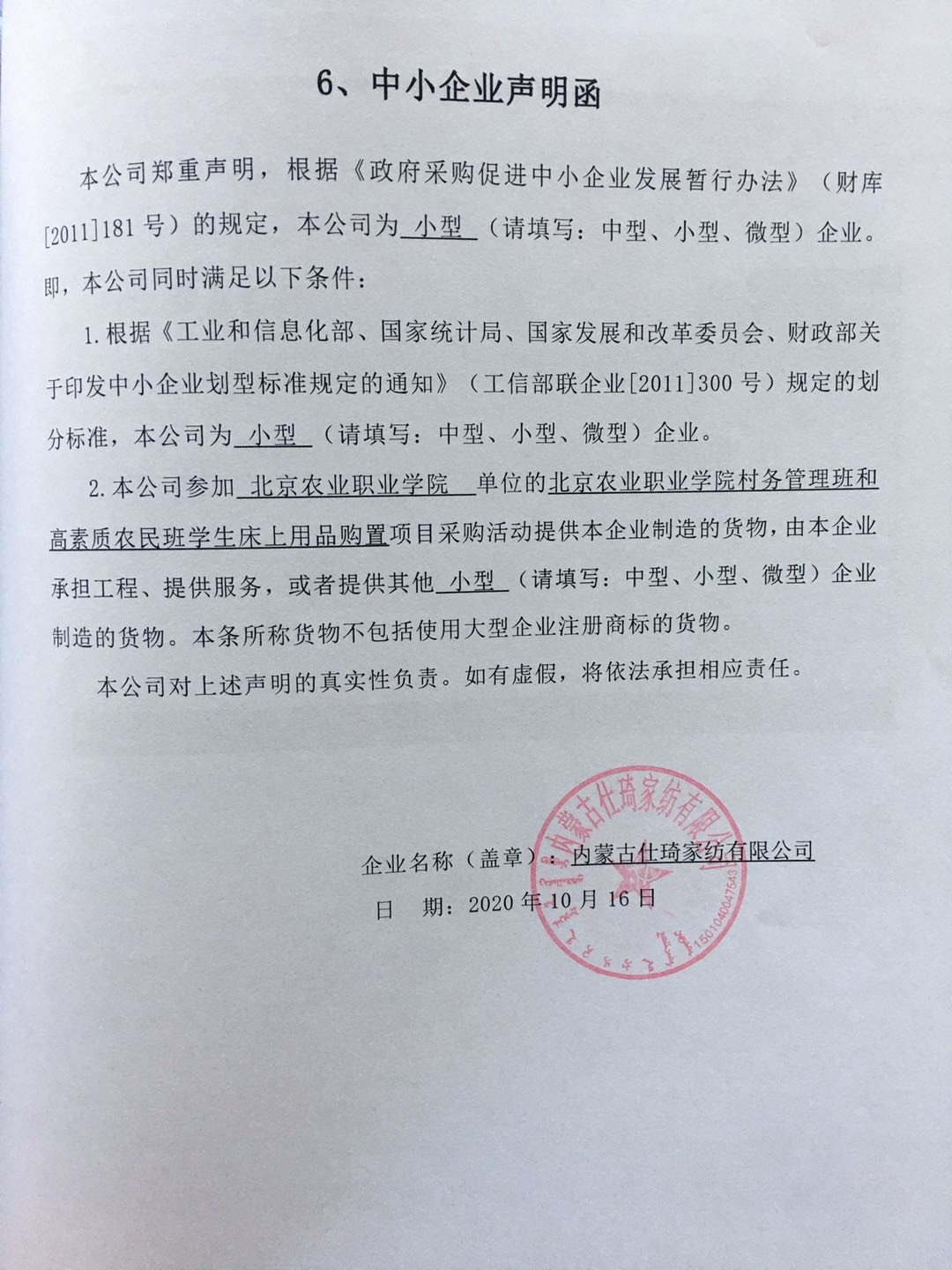 二、項目名稱:北京農業職業學院村務管理班和高素質農民班學生床上用品購置項目