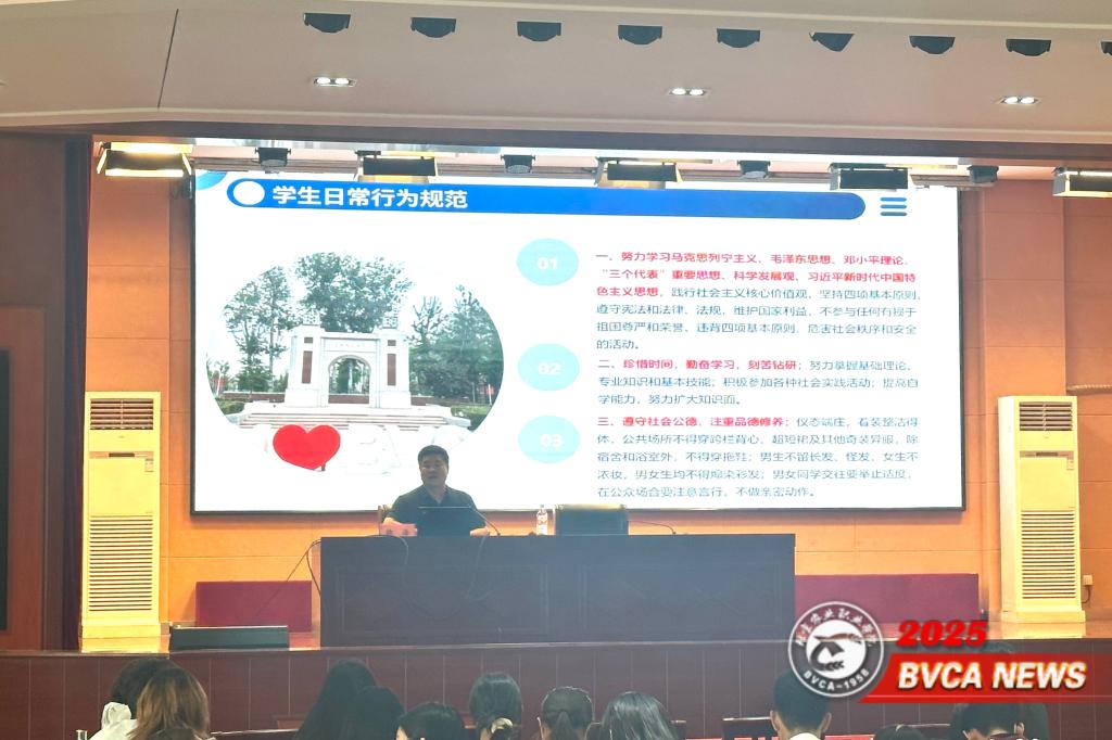教科研辦公室王小輝詳細解讀了學校學籍管理相關規定。他圍繞學籍注冊、課程選修、成績考核、畢業要求等方面,梳理了學習過程中的重要環節和注意事項,幫助新同學明確學業目標,規范學習行為,為順利度過大學生活奠定基礎。