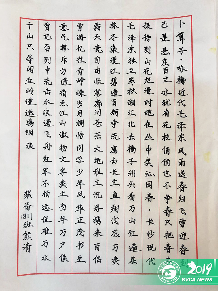 經過評委老師的評判,最終裝備1811班張欣穎同學的書法作品、裝備1811班熊清同學的硬筆書法作品脫穎而出,分獲兩組第一名。