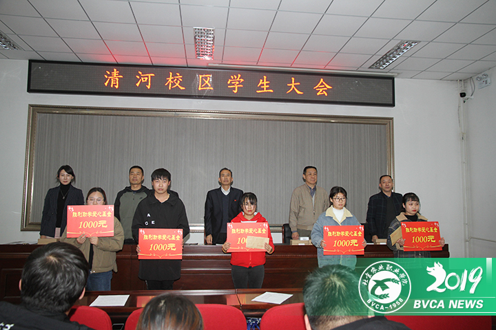 會上,首先進行了“勝利助學愛心基金”發放儀式。該基金由退休教師王勝利個人出資,以資助清河校區經濟困難且品學兼優的學生。經過學生本人申請,班主任輔導員推薦,評審組審核,黨總支批準公示等流程,今年共有六名學生獲得了“勝利助學愛心基金”。發放儀式上,諸剛同志宣讀了受資助學生名單。受資助學生代表對老師和學校表達了感謝之情,并表示將努力學習,不辜負老師的關懷和期望。黨群工作科科長栗朝明致辭,他表達了對王勝利老師的感謝,也希望同學們克服困難,樂觀向上。最后,葉克同志講話,他通過身邊人的案例,激勵同學們要感恩父母、感恩良師益友,學會在逆境中成長成才。