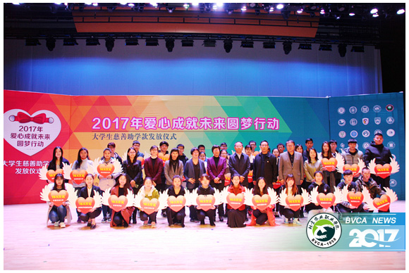 11月8日,2017年“愛心成就未來圓夢行動”助學款發放儀式在首都經濟貿易大學舉行,我院畜牧獸醫系2017級遲美玲同學代表學院上臺接受捐贈款。市學生資助中心、市慈善協會、首都經濟貿易大學和捐贈企業代表北京金鼎軒酒樓有限責任公司相關負責人出席活動,來自北京師范大學、北京理工大學和我院在內的36所北京高校300余名師生人歡聚一堂,共同見證了愛心助學款發放儀式。
