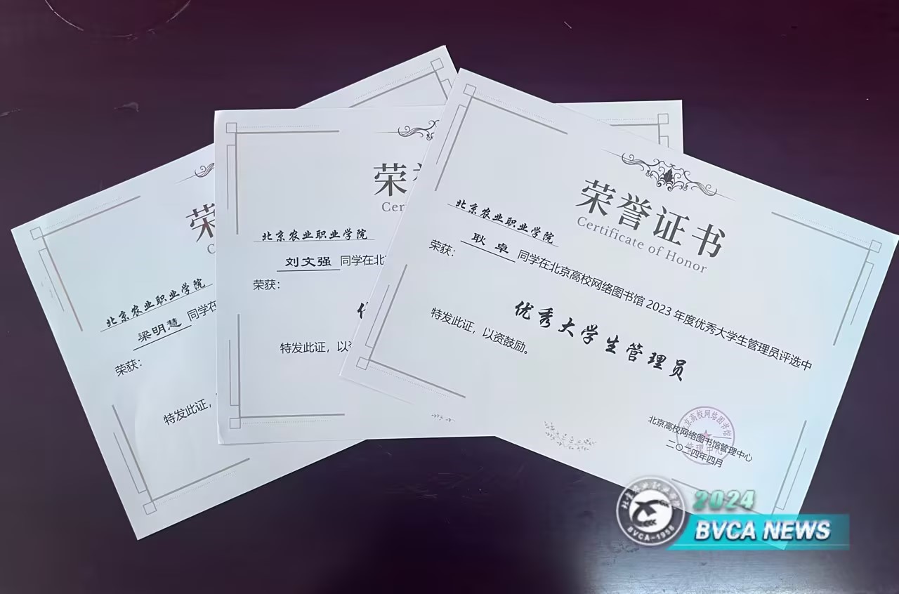 5月29日,北京高校網(wǎng)絡(luò)圖書館管理中心舉行2024年成員館館長工作會議。會上對各成員館2023年度優(yōu)秀志愿者和優(yōu)秀學(xué)生管理員進行表彰。我校3名學(xué)生館員獲評“2023年度優(yōu)秀大學(xué)生管理員”,分別是智慧農(nóng)業(yè)工程學(xué)院物聯(lián)2111班劉文強、動物科技學(xué)院醫(yī)動2212班耿卓和園藝園林學(xué)院園林2111班梁明慧同學(xué)。