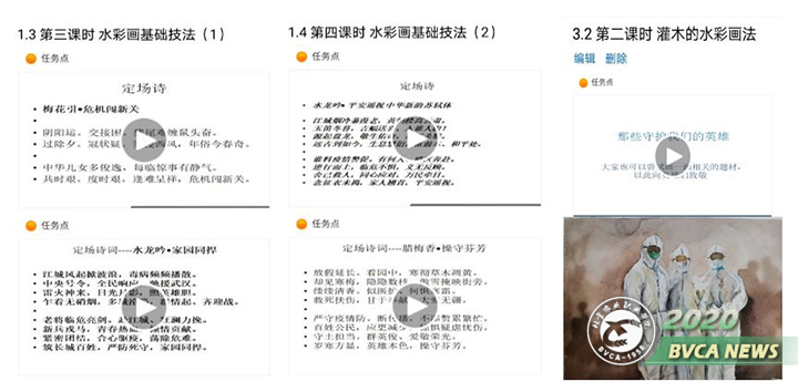 培養(yǎng)文化自信、厚植愛國情懷,激發(fā)保護生態(tài)意識,樹立責任與擔當一直都是園林技術專業(yè)各門課程的思政教學目標。本次線上教學,專業(yè)教師們充分挖掘疫情防控中的課程思政元素,開展了各具特色的“線上課程思政”。如:講授《水彩風景畫》課程的張勁農(nóng)老師在線上備課之初就思考了如何將疫情期間全國人民萬眾一心,眾志成城的民族文化精神滲透到教學中。將寒假期間隨著疫情發(fā)展自己創(chuàng)作的詩詞放在網(wǎng)課中,以定場詩詞的形式表達普通百姓的家國情懷,贊頌逆行者,鼓勵學生們向醫(yī)護們學習,不畏困苦,擔當責任。在技法訓練中引導學生用畫筆向英雄們致敬,提高學生的創(chuàng)新思維能力的同時,形成致敬崇尚英雄的良好風尚。