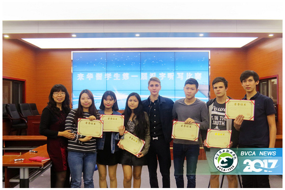 活動(dòng)旨在正確引導(dǎo)留學(xué)生感受漢字之美,培養(yǎng)他們認(rèn)真規(guī)范書(shū)寫漢字的良好習(xí)慣。比賽分初級(jí)、中級(jí)組進(jìn)行,以《發(fā)展?jié)h語(yǔ)初級(jí)》、《發(fā)展?jié)h語(yǔ)中級(jí)》教材中涉及的相關(guān)詞匯、生活中的常用詞匯,以及有代表性的漢語(yǔ)基礎(chǔ)字詞作為比賽素材。為體現(xiàn)趣味性,每輪比賽包括根據(jù)圖片寫漢字和聽(tīng)寫漢字兩個(gè)環(huán)節(jié)。賽前,學(xué)生抽簽決定A隊(duì)、B隊(duì),采取各隊(duì)各推選1名選手對(duì)決,寫錯(cuò)的選手被淘汰,寫對(duì)者繼續(xù)下一輪對(duì)決的形式進(jìn)行,增加比賽的競(jìng)技性和公平性。比賽在緊張、熱烈的氣氛中進(jìn)行,經(jīng)過(guò)一個(gè)半小時(shí)的激烈角逐,站到最后的選手所在隊(duì)成為勝出隊(duì),在勝出隊(duì)中分別評(píng)選出一等獎(jiǎng)1名、二等獎(jiǎng)2名、三等獎(jiǎng)3名。