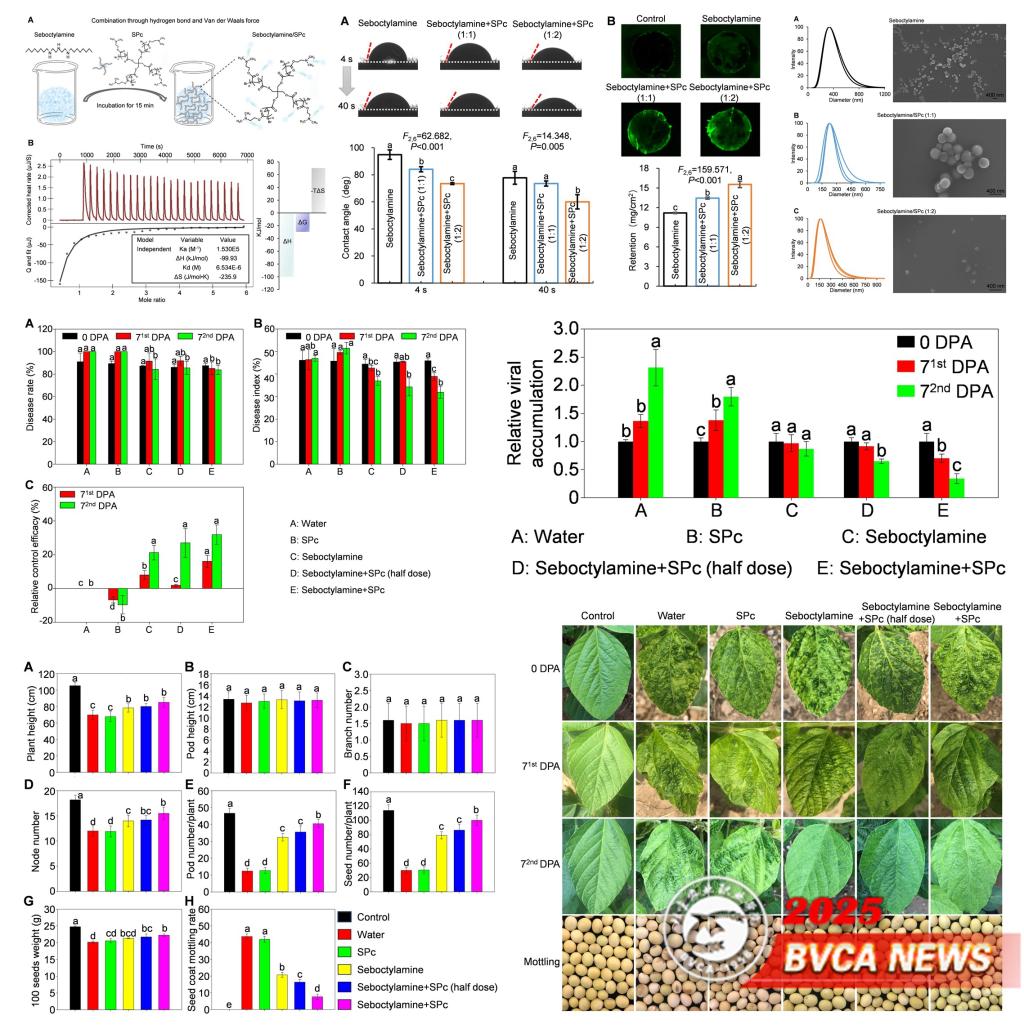 該研究成功設計開發了一種具有強粘附性能的自組裝納米抗病毒農藥,大幅改善了農藥的理化性質并提升農藥分子的遞送效率,顯著提升了大豆花葉病毒(SMV)的田間防治效果,為SMV的防治提供了新的方法策略。