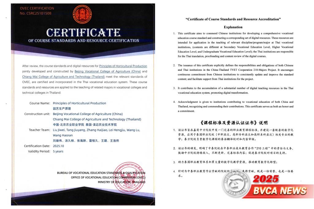 由我校劉繼偉、湯久楊、張海嬌、雷恒久、王璐、王浩然六位教師組成的課題團隊,與泰國清邁農業技術學院建設完成《園藝生產原理》課程標準和資源,獲頒泰國教育部職業教育委員會課程標準與資源認證證書。