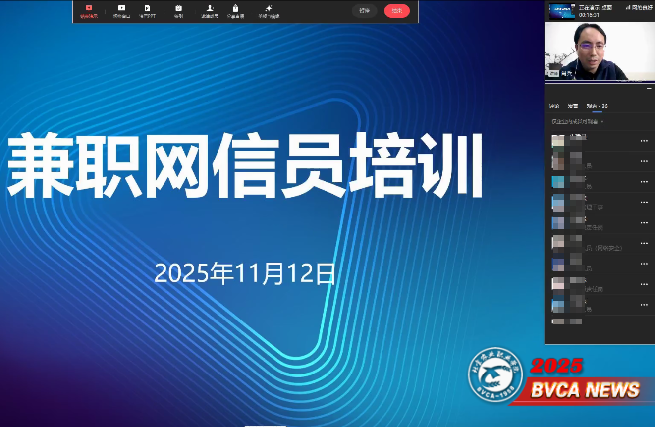 11月12日下午,信息中心以企業微信直播形式,組織開展兼職網信員2025年第三期專題培訓。培訓由信息中心副主任肖兵主講,各中層單位兼職網信員在線學習。