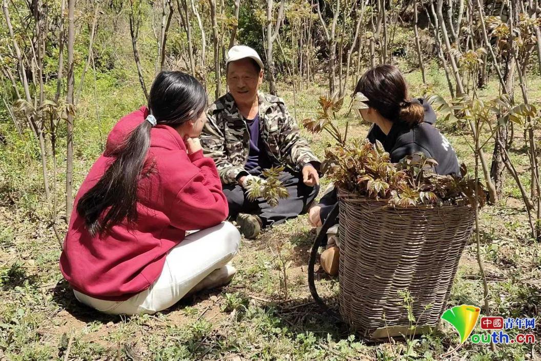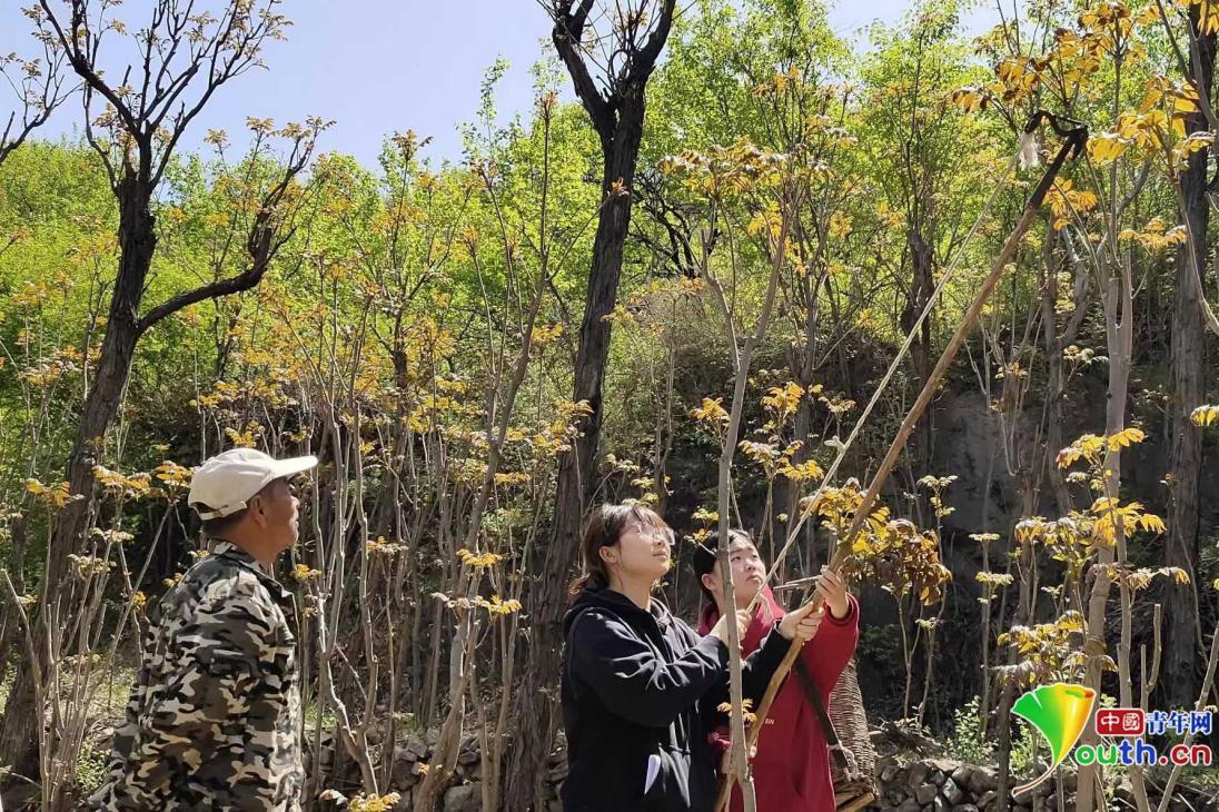 孟雨晴(右一)正在和團隊伙伴一起采集香椿芽。本人供圖