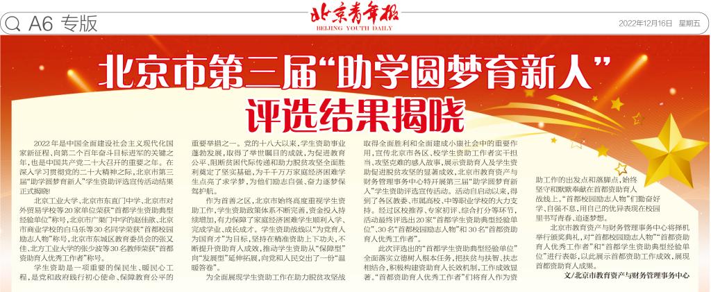 首都助學圓夢育新人評選結果揭曉,北京市教育資產與財務管理事務中心將擇機舉行頒獎典禮,對“首都學生資助典型經驗單位”“首都資助育人優秀工作者”和“首都校園勵志人物”進行表彰。我院牧醫系韓靜儒同學入圍勵志人物,向社會展示了學院三全育人和資助育人的優秀成果。