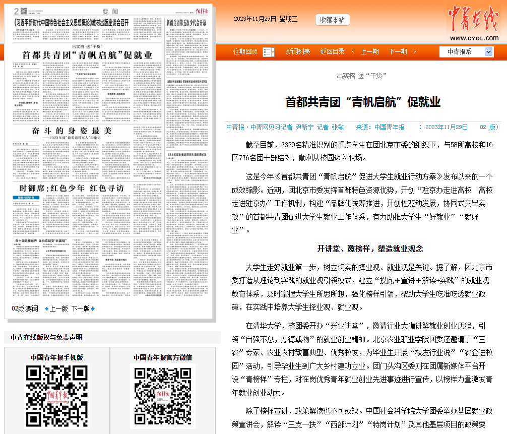 在清華大學(xué),校團(tuán)委開(kāi)辦“興業(yè)講堂”,邀請(qǐng)行業(yè)大咖講解就業(yè)創(chuàng)業(yè)歷程,引領(lǐng)“自強(qiáng)不息,厚德載物”的就業(yè)創(chuàng)業(yè)精神。北京農(nóng)業(yè)職業(yè)學(xué)院團(tuán)委還邀請(qǐng)了“三農(nóng)”專家、農(nóng)業(yè)農(nóng)村致富典型、優(yōu)秀校友,為畢業(yè)生開(kāi)展“校友行業(yè)說(shuō)”“農(nóng)企進(jìn)校園”活動(dòng),引導(dǎo)畢業(yè)生到廣大鄉(xiāng)村建功立業(yè)。團(tuán)門頭溝區(qū)委則在團(tuán)屬新媒體平臺(tái)開(kāi)設(shè)“青榜樣”專欄,對(duì)在崗優(yōu)秀青年就業(yè)創(chuàng)業(yè)先進(jìn)事跡進(jìn)行宣傳,以榜樣力量激發(fā)青年就業(yè)創(chuàng)業(yè)動(dòng)力。