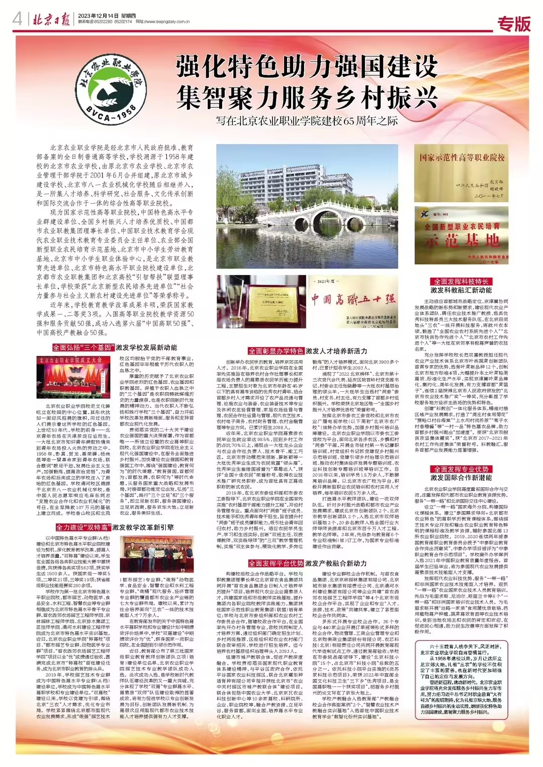 12月14日 《北京日報》:?強化特色助力強國建設 集智聚力服務鄉村振興——寫在北京農業職業學院建校65周年之際