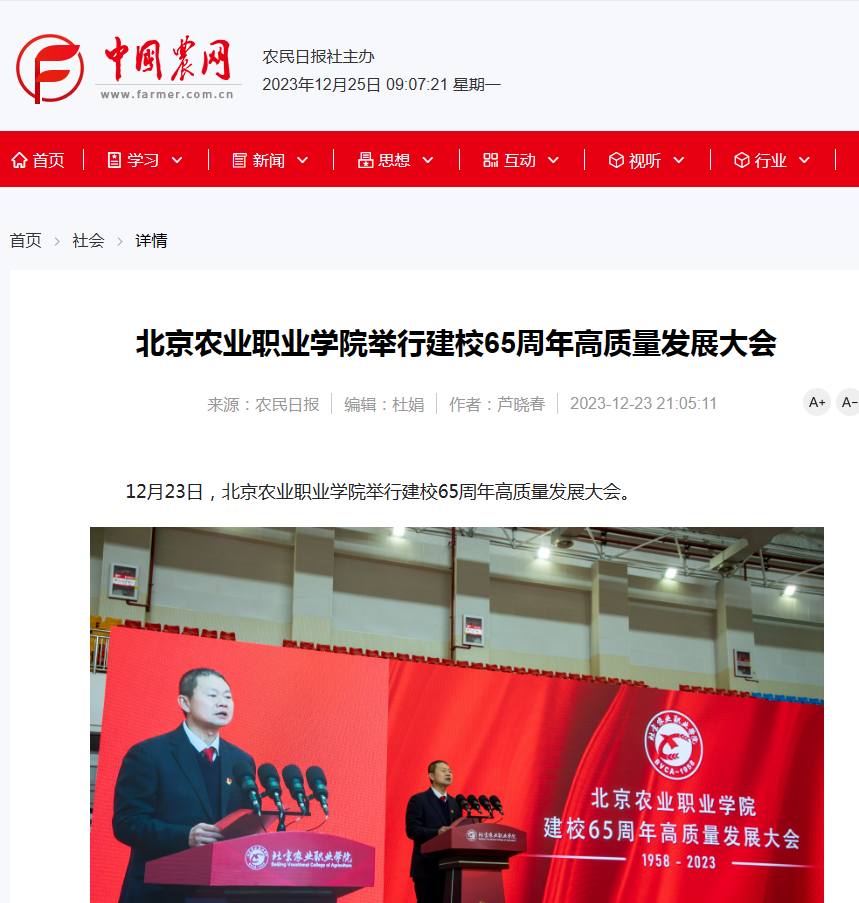 12月23日,北京農(nóng)業(yè)職業(yè)學(xué)院舉行建校65周年高質(zhì)量發(fā)展大會。