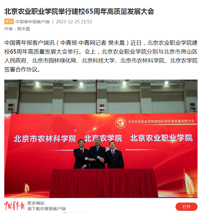 12月25日 中國青年報客戶端:北京農業職業學院舉行建校65周年高質量發展大會