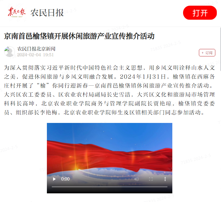為深入貫徹落實習(xí)近平新時代中國特色社會主義思想,用鄉(xiāng)風(fēng)文明詮釋山水人文之美,促進(jìn)休閑旅游與鄉(xiāng)風(fēng)文明融合發(fā)展。2024年1月31日,榆垡鎮(zhèn)在西麻各莊村開展了“榆”你同行迎新春—京南首邑榆垡鎮(zhèn)休閑旅游產(chǎn)業(yè)宣傳推介活動。大興區(qū)農(nóng)工委委員、區(qū)農(nóng)業(yè)農(nóng)村局副局長史雪潔,大興區(qū)文化和旅游局市場管理科科長高坤,北京農(nóng)業(yè)職業(yè)學(xué)院商務(wù)與管理學(xué)院副院長賈艷瓊,榆垡鎮(zhèn)黨委委員、組織部長李艷梅,北京農(nóng)業(yè)職業(yè)學(xué)院師生及區(qū)鎮(zhèn)相關(guān)部門同志參加活動。