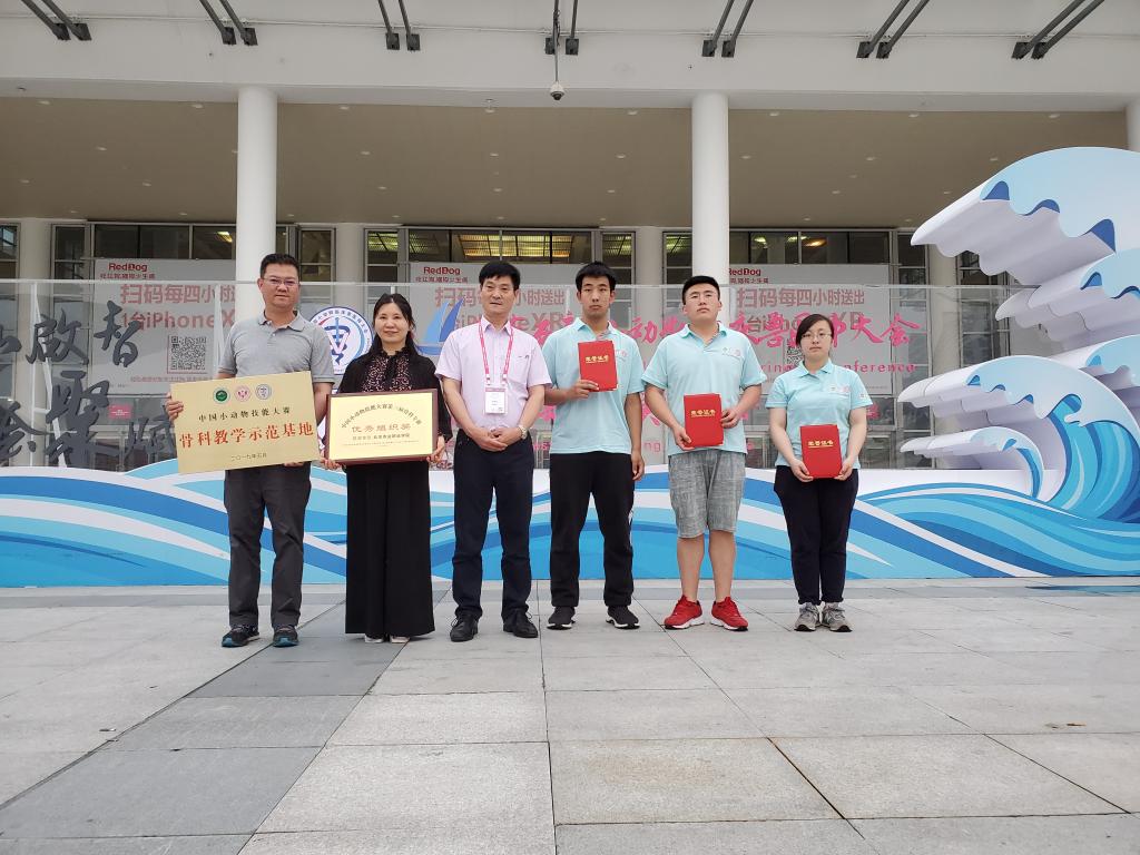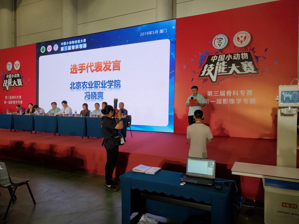 5月20至23日,2019年第三屆中國小動物臨床技能大賽骨科專賽決賽在廈門國際會展中心舉行,大賽由全國農業職業教育指導委員會指導,中國現代農業職業教育集團和東西部小動物臨床獸醫師大會主辦。在主任曹授俊教授和副主任周珍輝教授的帶領下,由指導教師張永東領隊,楊生濤、馮曉爽、郝玉春、彭睿雅四名同學組成的北京農業職業學院代表隊參加比賽,開幕式我校馮曉爽同學代表全國參賽選手發言。經過激烈的比賽,郝玉春同學表現優異斬獲大賽特等獎(同時獲得主辦方提供的暑假新加坡深造機會),楊生濤、馮曉爽、彭睿雅獲得三等獎。張永東、胡平老師獲得大賽優秀指導教師,張永東老師同時獲得大賽先進工作個人獎,北京農業職業學院獲得優秀組織獎和中國小動物技能大賽骨科教學示范基地的授牌。