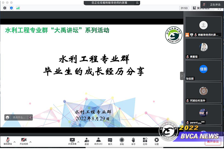 水建系水利專業為確保《水利工程施工綜合實訓》頂崗實習順利實施,引導學生更準確地了解頂崗實習崗位要求和素質需求;結合2022級新生入學教育工作,水利給排水專業黨支部“雙帶頭人”教師黨支部書記工作室、水利工程特高專業群、清河水利建設工程師學院結合系部“大禹講壇”活動的統籌安排,8月29日邀請了三位在不同單位、不同崗位就業的老畢業生開展了《水利工程專業群畢業生的成長經歷分享》專題講座;8月31日邀請了緊密型校企合作單位——北京京水建設集團有限公司人力資源部部長安燃開展了《企業領導講述眼中的優秀職工》專題講座,水利專業本學期頂崗實習學生、2022級水利專業新生、水利專業全體教師共計90余人,參加了本次“大禹講壇”系列活動。