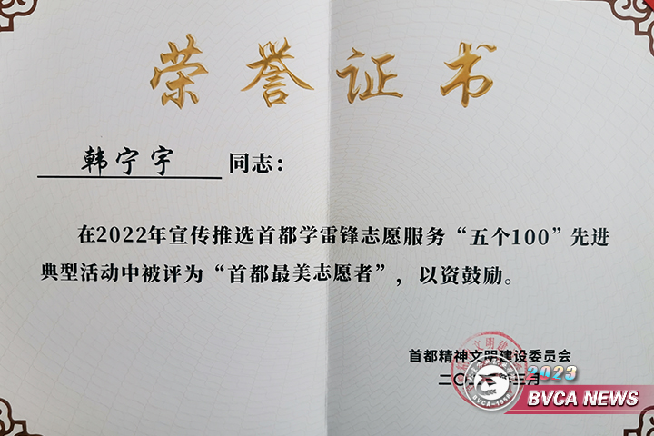 近日,我院畜牧獸醫(yī)系學生韓寧宇在2022年宣傳推選學雷鋒志愿服務“五個100”先進典型活動中,被評為“首都最美志愿者”。