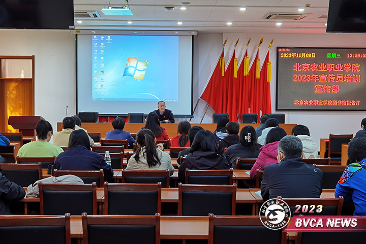 為深入學(xué)習(xí)宣傳貫徹習(xí)近平文化思想,貫徹落實全市思想文化工作會議精神,做好新形勢下學(xué)院宣傳思想文化工作,提高全院宣傳員隊伍思想政治素養(yǎng)和業(yè)務(wù)水平,11月8日下午,學(xué)院在長陽校區(qū)圖書館學(xué)術(shù)報告廳開展了2023年宣傳員培訓(xùn)。北京市委農(nóng)工委宣傳與文化處處長顧崇華受邀作《深入學(xué)習(xí)貫徹習(xí)近平文化思想 守正創(chuàng)新做好宣傳思想文化工作 凝心鑄魂共促首都鄉(xiāng)村全面振興》主題講座。講座由學(xué)院黨委常委、宣傳部部長趙章彬主持。全體宣傳員和部分學(xué)生代表參加培訓(xùn)。